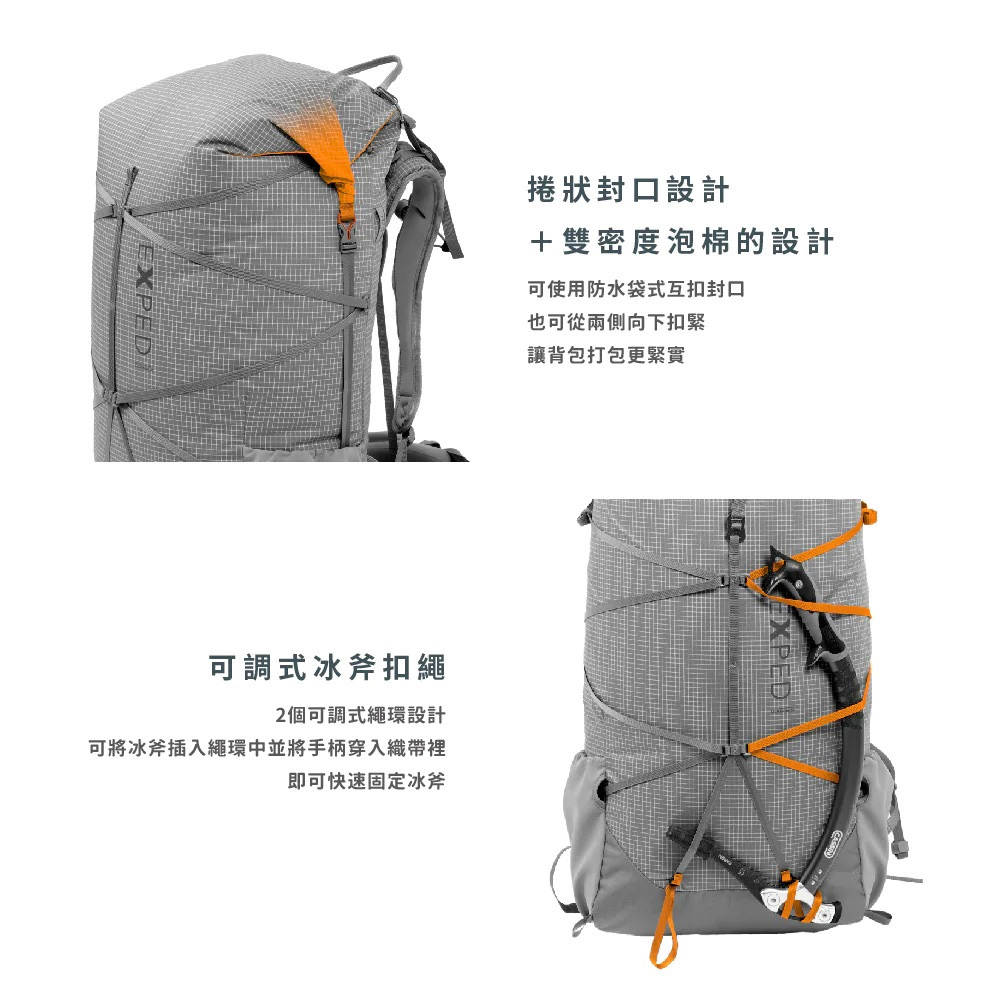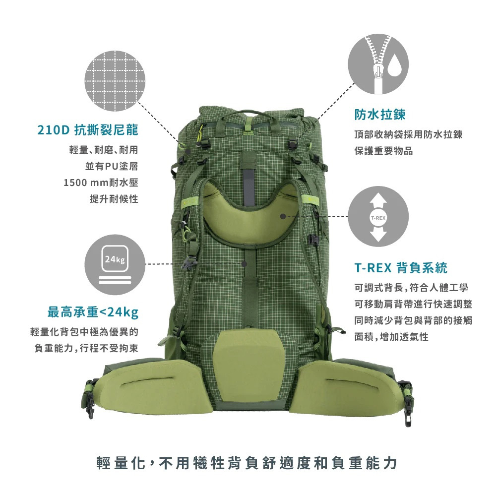 注意: 本背包採用耐水壓 1500mm 抗撕裂尼龍布料,唯車縫線未做防水處理,仍需建議加購準備背包防水外套,以利於連續下雨氣候套上,阻擋雨水從車縫線滲入。