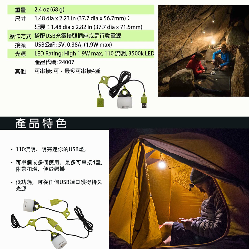 | 商品特色 | 110流明、明亮迷你的USB燈 (單一光源) 可單個或多個使用,最多可串接4盞,附帶扣環,便於懸掛 低功耗,可從任何USB端口獲得持久光源 |