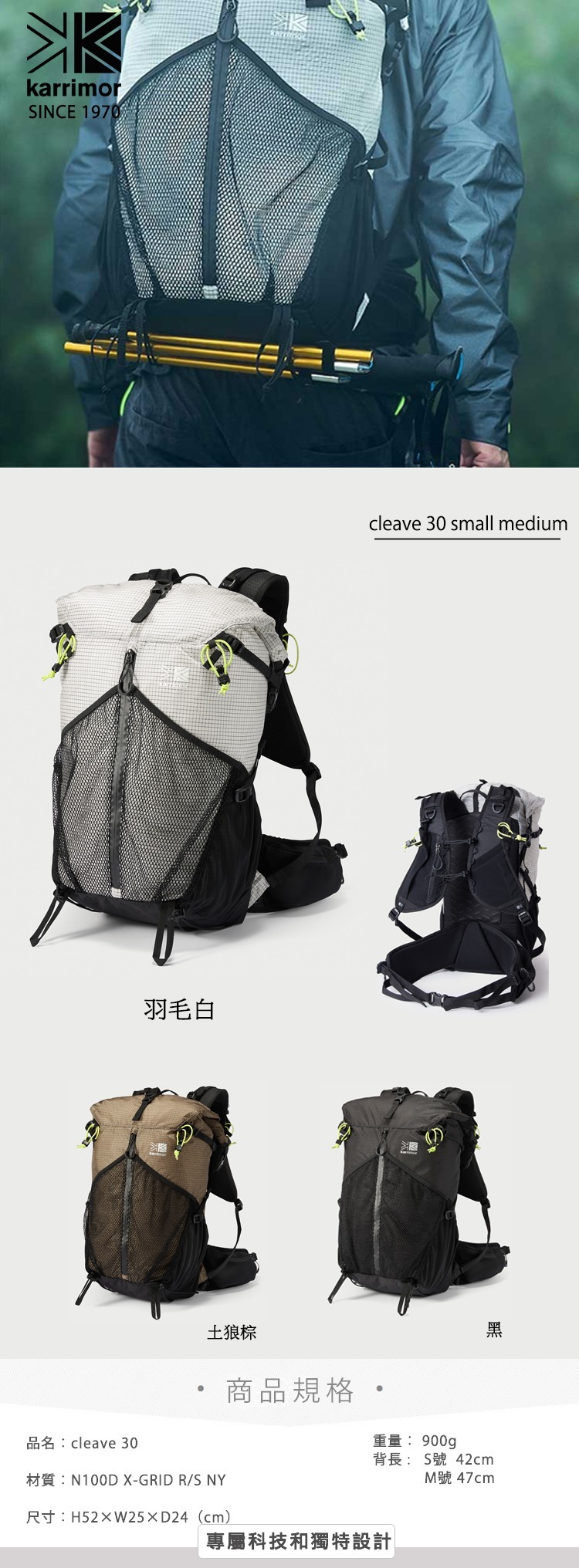 | 商品特色 | .採用強度優異的X-GRID R/S布料,可調整容量的捲頂式設計。 .這款背包配備了實用肩帶等豐富的功能,旨在提供「移動時的舒適操作性」和「行李的取放、收納的便利性」。 .實現具有機動性的登山風格,適合短程旅行、攀岩地區和艱難的登山。 |