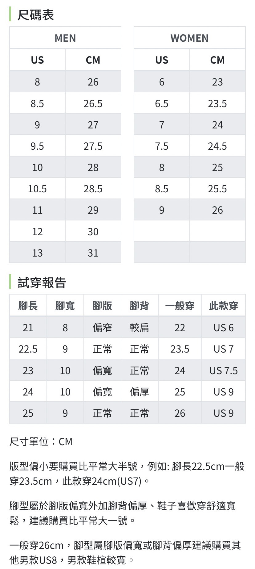 一般穿26cm,腳型屬腳版偏寬或腳背偏厚建議購買其他男款US8,男款鞋楦較寬。