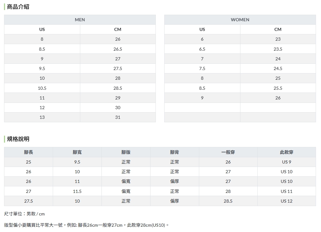 版型偏小要購買比平常大一號,例如: 腳長26cm一般穿27cm,此款穿28cm(US10)。