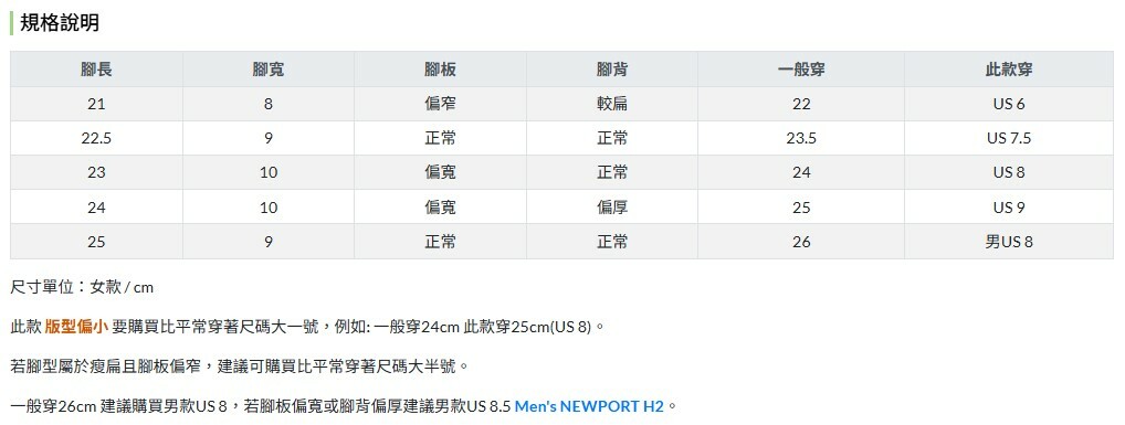 一般穿26cm 建議購買男款US 8,若腳板偏寬或腳背偏厚建議男款US 8.5 Men's NEWPORT H2。