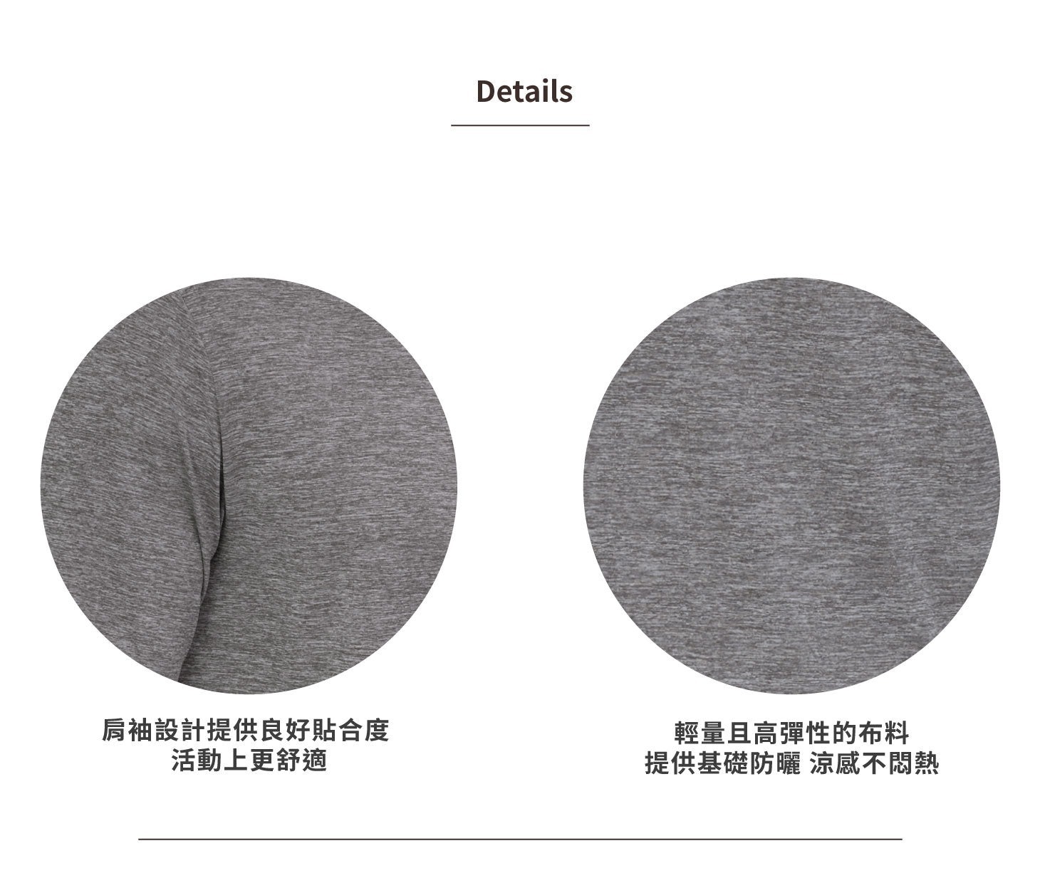 | 材質 | 混色紗:100%聚酯纖維(50%再生) HeiQ® Pure 異味控制和 miDori™ bioSoft,增加吸濕排汗和柔軟度。 布料通過bluesign®認證。 |