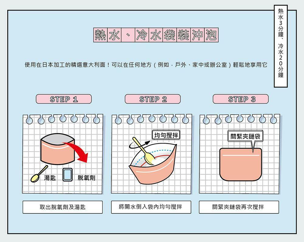 3.注入水後,關緊夾鏈袋靜候(熱水15分鐘、冷水(15°C)60分鐘,再次攪拌即可享用