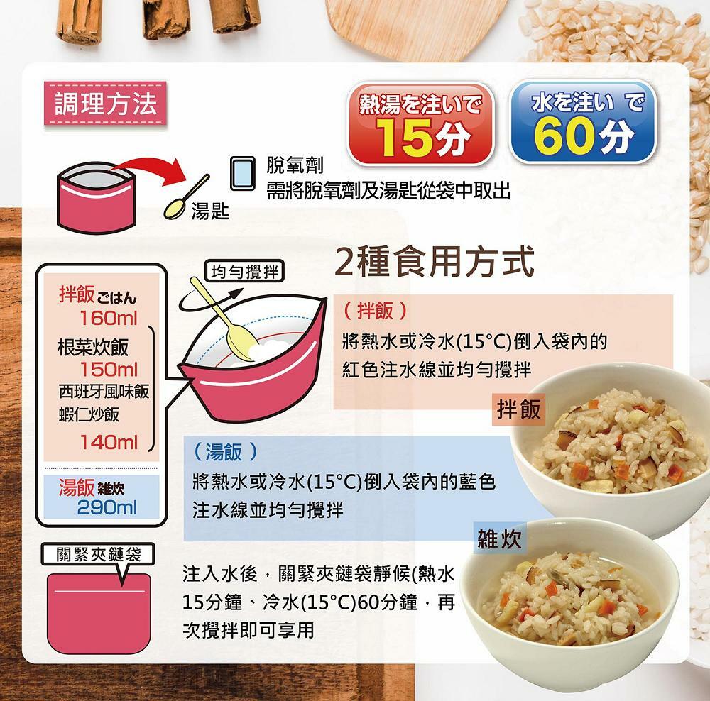 拌飯-將熱水或冷水(15°C)倒入袋內的紅色注水線並均勻攪拌