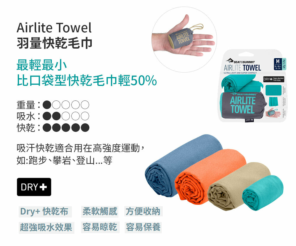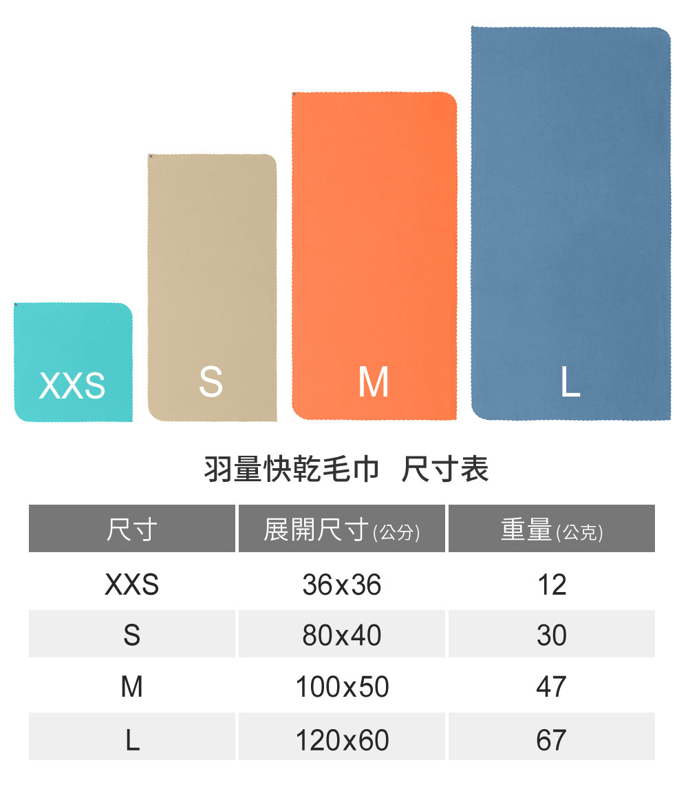 超輕量設計、打包體積最小,2XS號僅12g(36*36cm),可與收納袋結合方便懸掛,吸汗快乾適合用在高強度運動,如:跑步、攀岩、登山...等。
