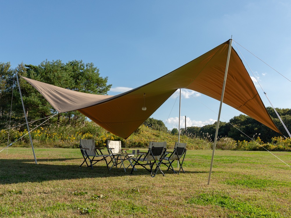 一頂由三支240cm營柱所撐起的天幕,為了有效利用天幕下的空間,此款天幕降低了擺放桌椅的中央部位,並且提高了人們動線上的部位。