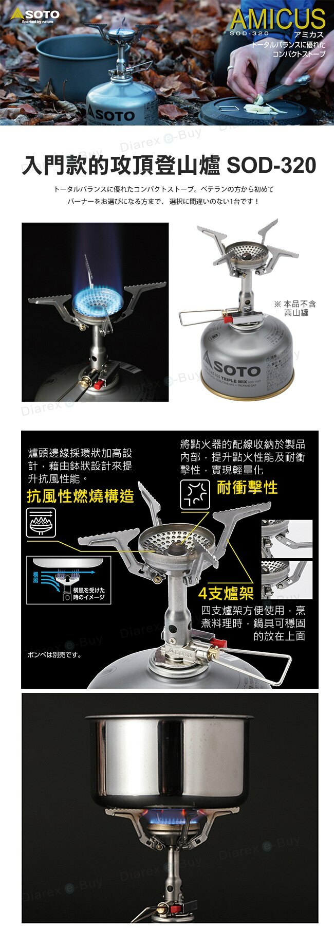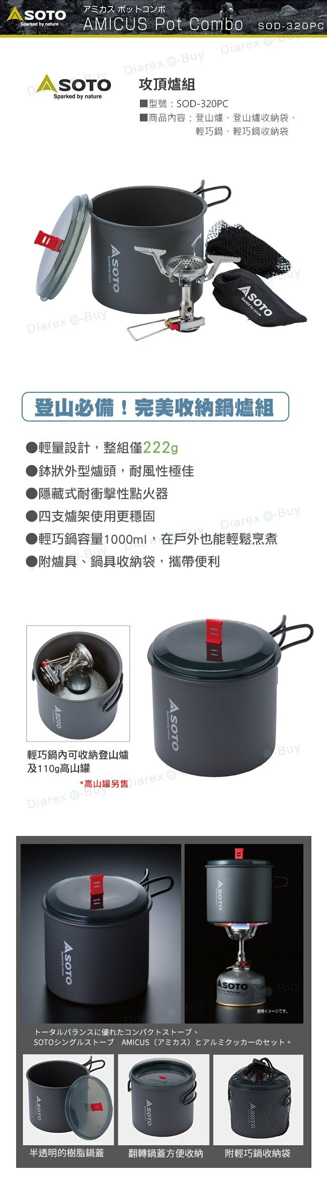 | 商品特色 | ● 本商品為電子點火 ●輕量設計,整組僅222g ●鉢狀外型爐頭,耐風性極佳 ●隱藏式耐衝擊性點火器 ●四支爐架使用更穩固 ●輕巧鍋容量1000ml,在戶外也能輕鬆烹煮 ●附爐具、鍋具收納袋,攜帶便利 |