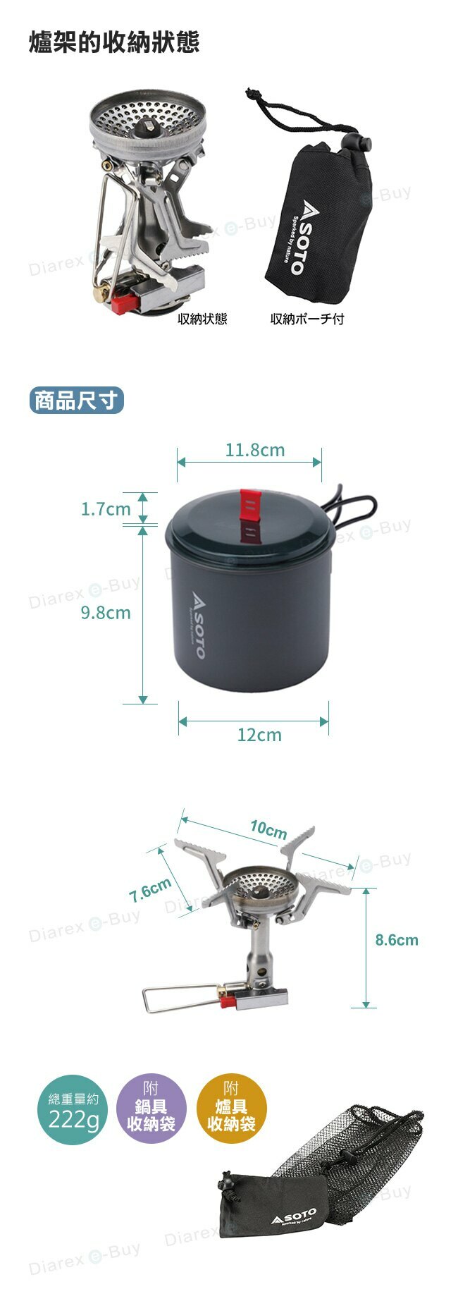 | 商品內容 | 登山爐、輕巧鍋、登山爐收納袋、輕巧鍋收納袋 |