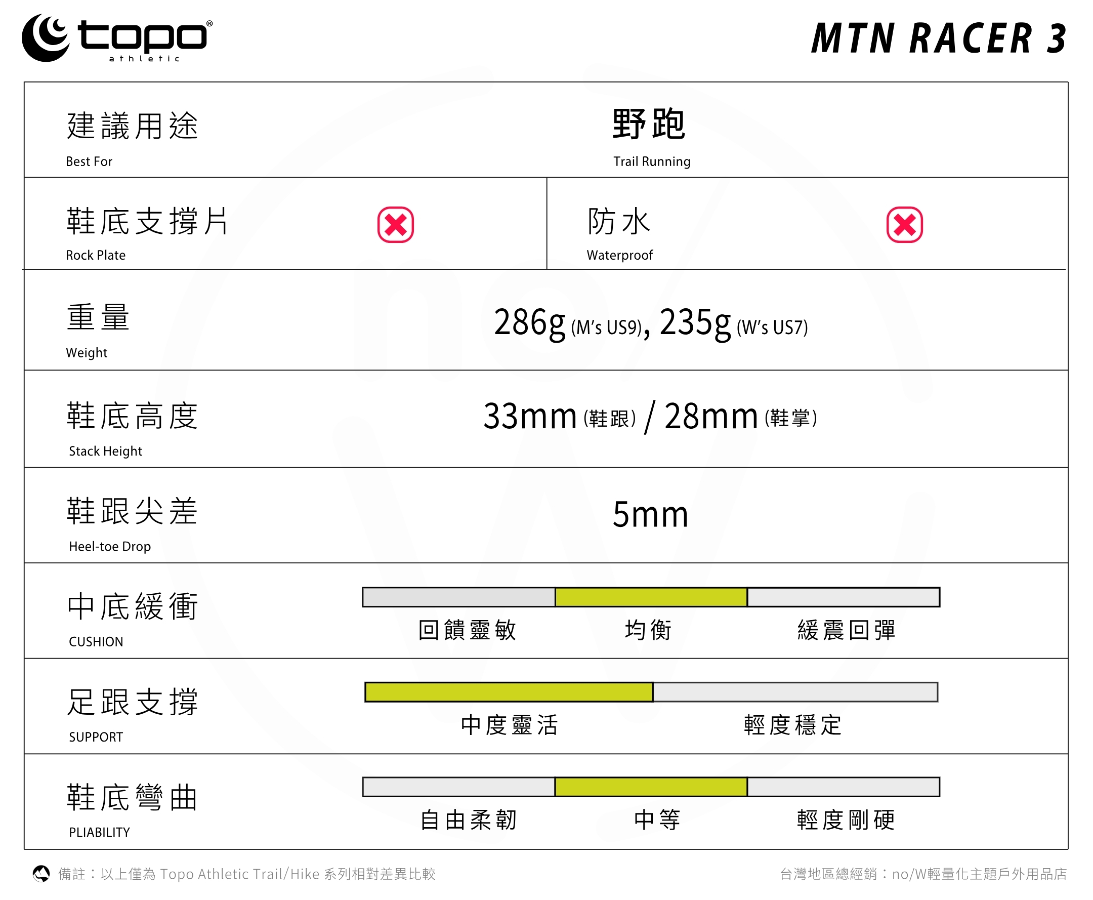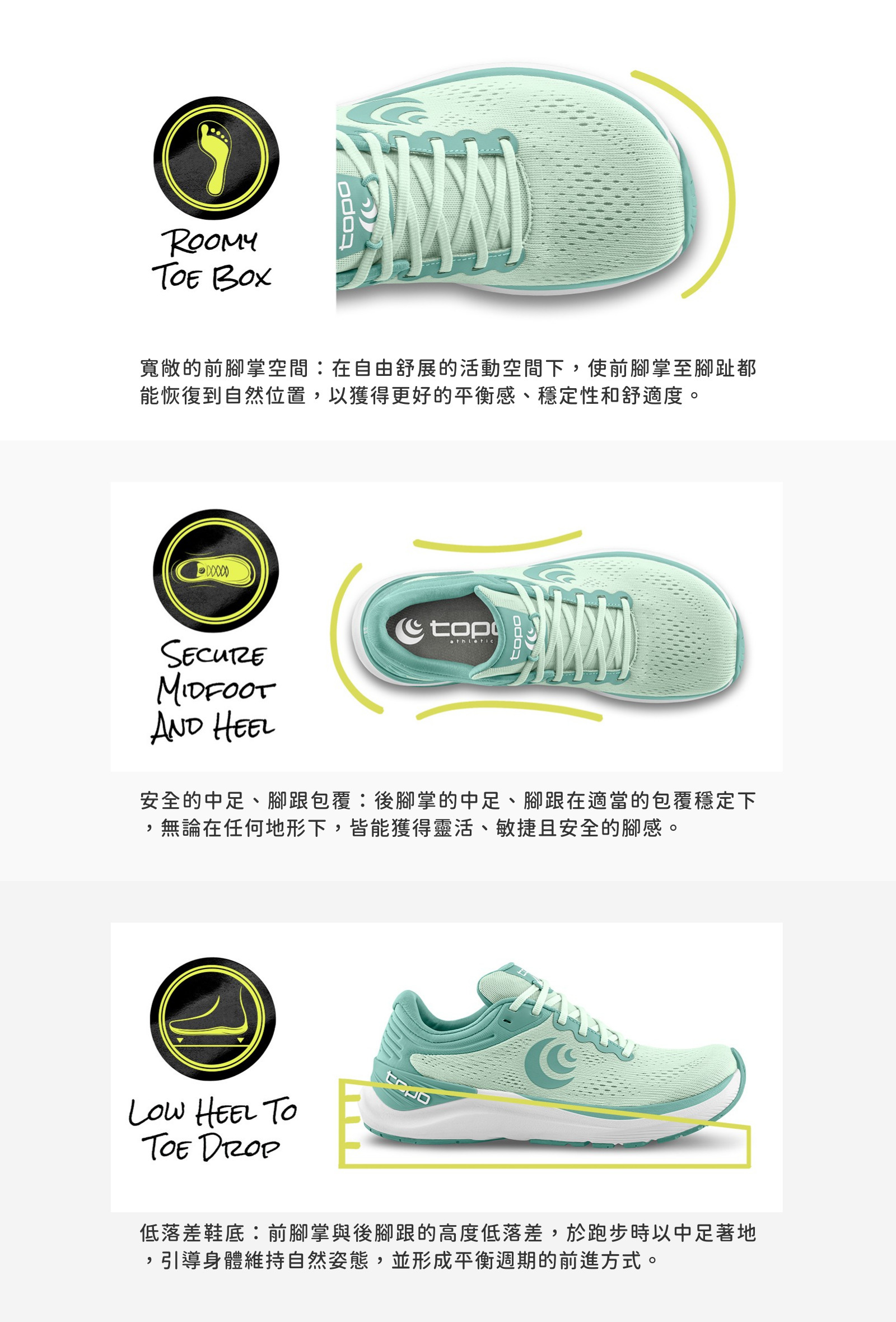 商品特色 .Topo Athletic 標誌性的寬敞鞋頭,使前腳掌與腳趾擁有能完全舒展的空間,符合天生行走與跑步的人體工學,獲得 APMA 美國足病醫學協會的認證,其設計能有效地促進足部健康。