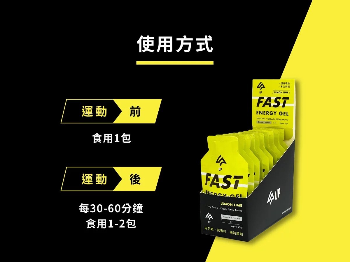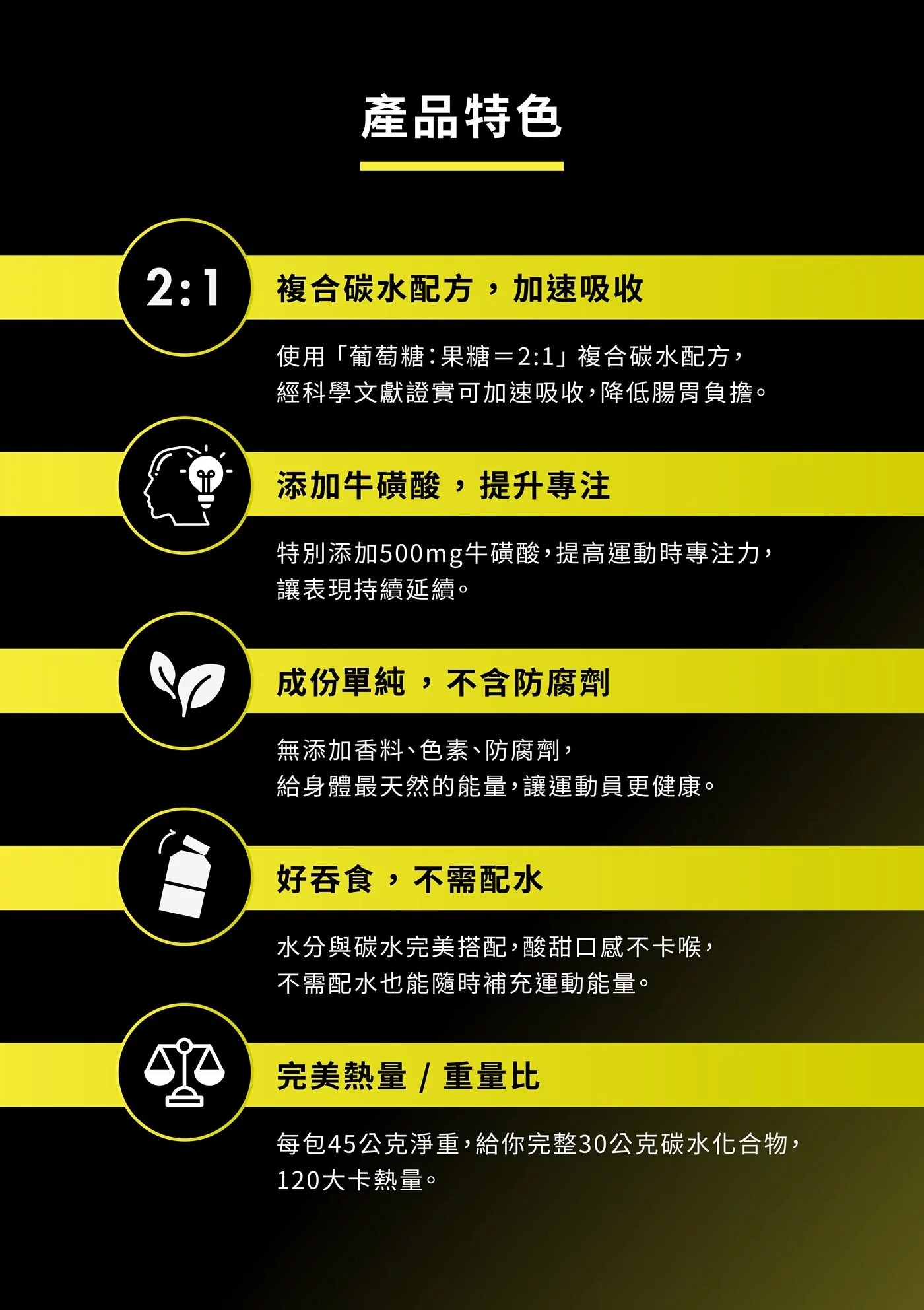 | 商品特色 | 1. 使用葡萄糖:果糖=2:1複合碳水配方,經科學文獻證實可加速吸收,降低腸胃負擔 2. 特別添加500mg牛磺酸,提高運動時專注力,讓表現持續延續 3. 成份天然,無添加香料、色素、防腐劑 4. 好吞食不需配水,酸甜口感不卡喉 5. 完美熱量/重量比,每包45公克淨重,給你完整30公克碳水化合物,120大卡熱量 |