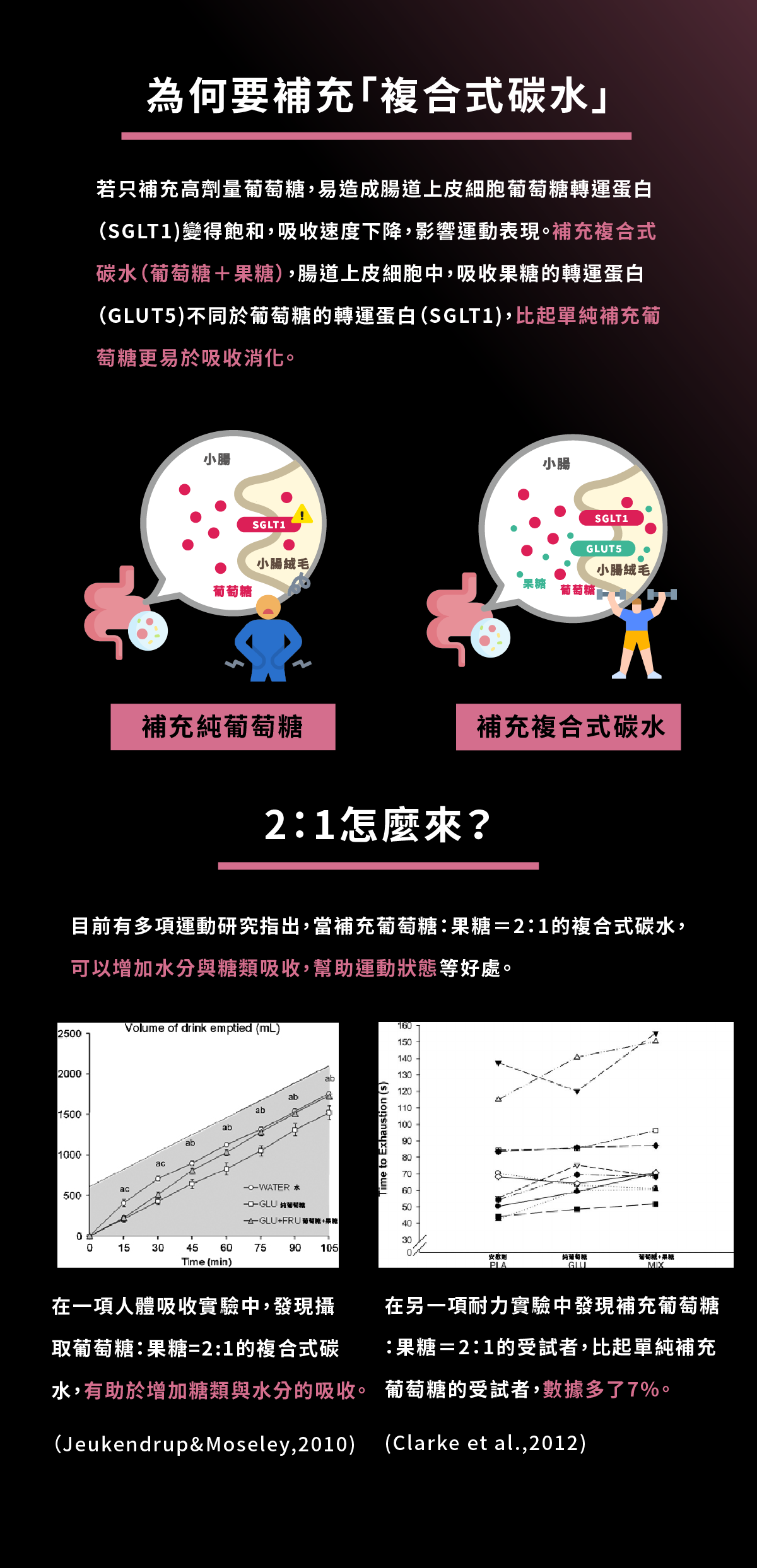 使用葡萄糖:果糖=2:1複合碳水配方,經科學文獻證實可加速吸收,降低腸胃負擔 ,全素可食用