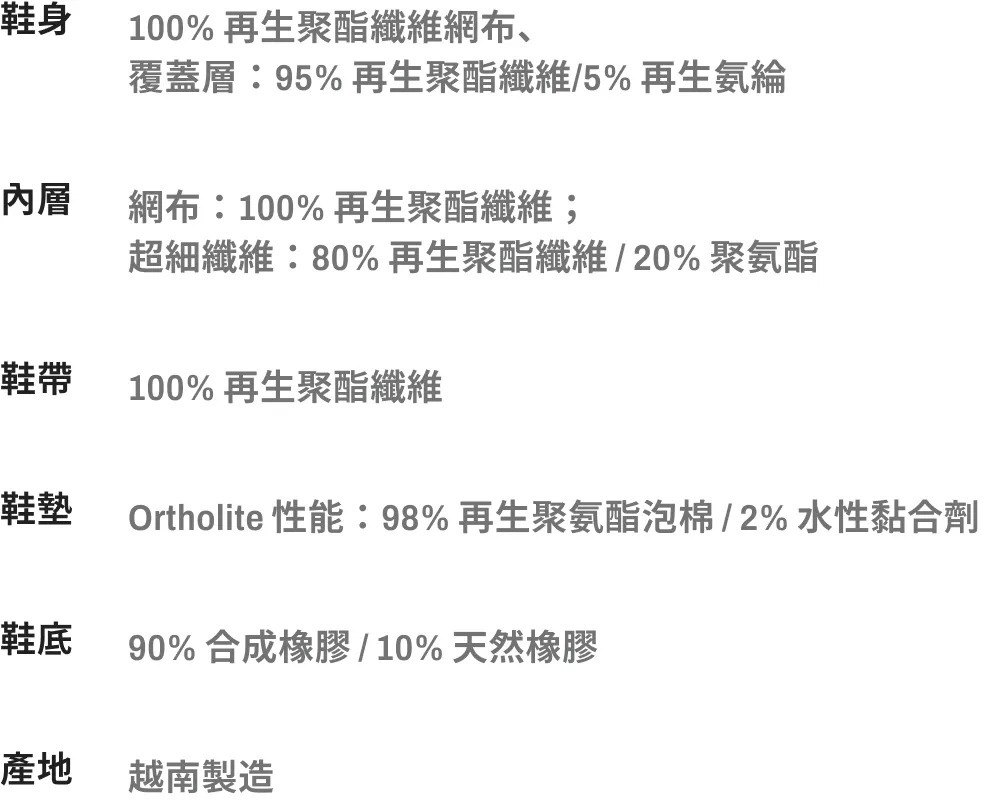 | 材質 | 鞋身:100% 再生聚酯纖維網布、覆蓋層:95%再生聚酯纖維、5% 再生氨綸 內層:網布:再生聚酯纖維;超細纖維:80%再生聚酯纖維、20% 聚氨酯 鞋墊:Ortholite性能:98%再生聚氨酯泡棉、2% 水性黏合劑 鞋帶:100% 再生聚酯纖維 鞋底:90%合成橡膠、10%天然橡膠 |