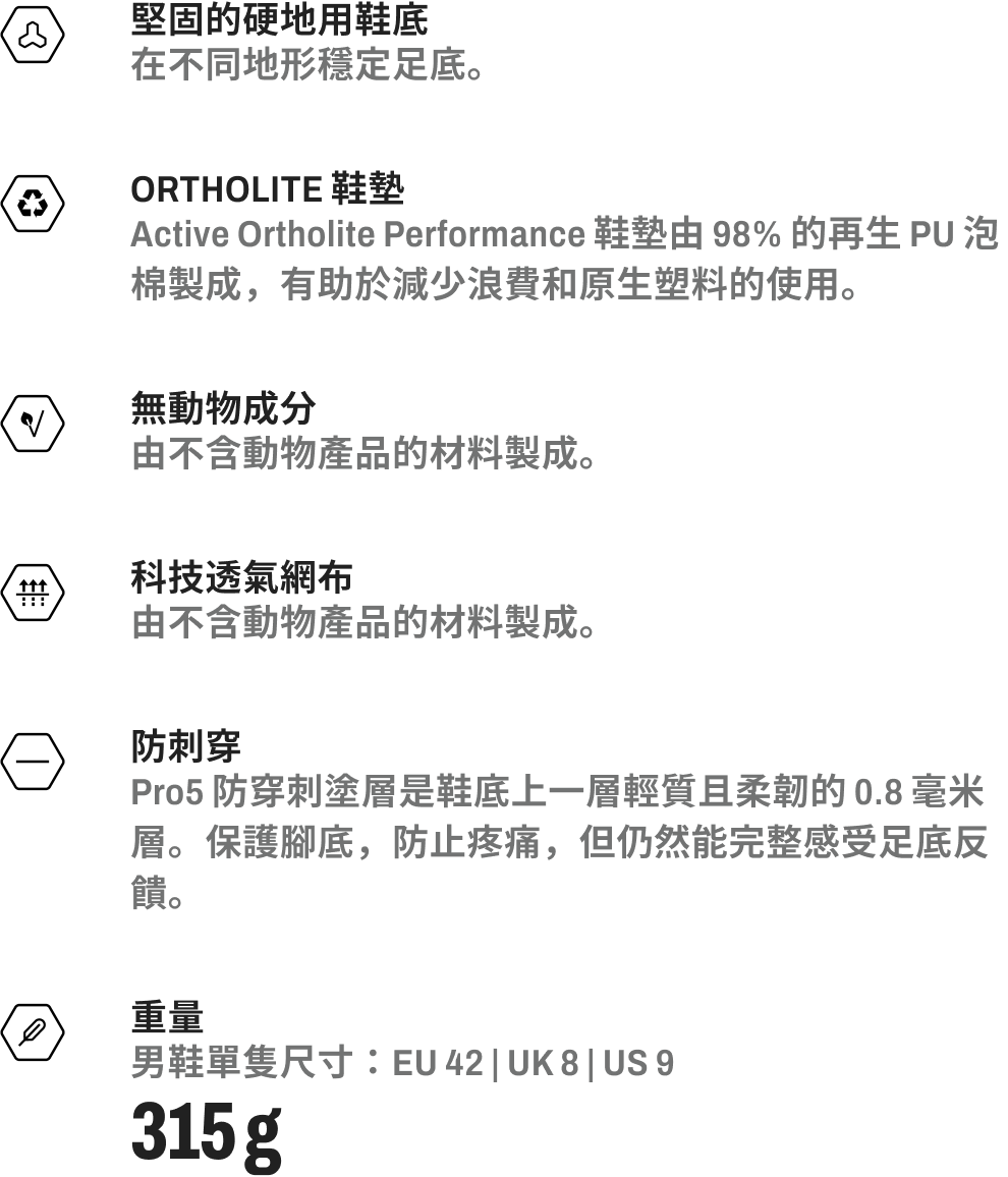 | 重量 (單腳) | 315g (EU 42|UK 8|US 9) |