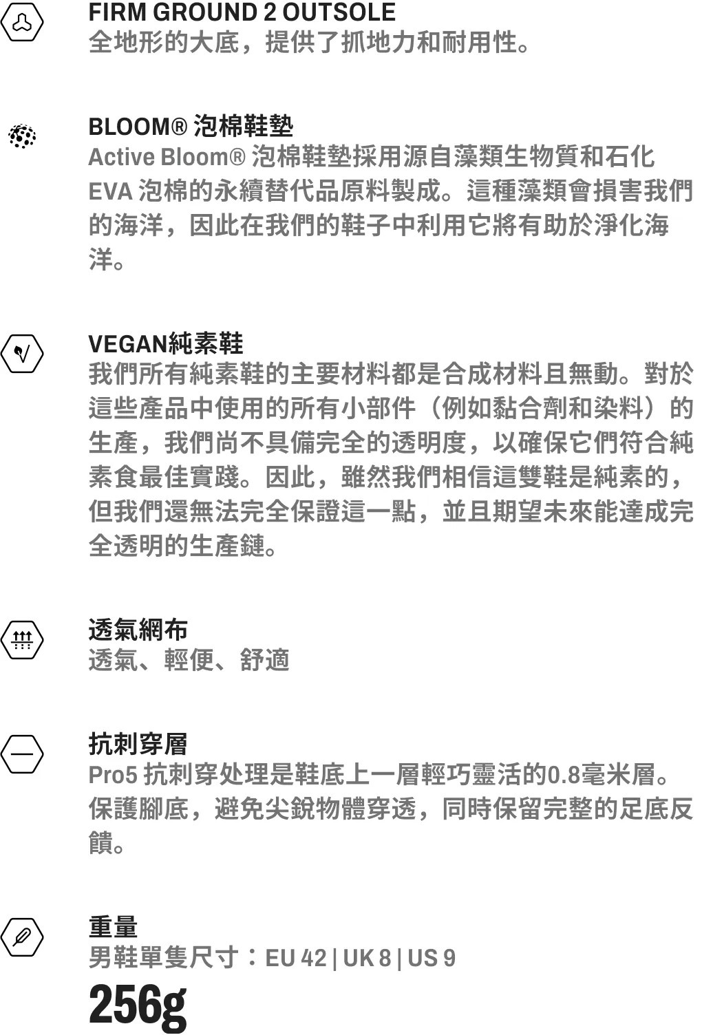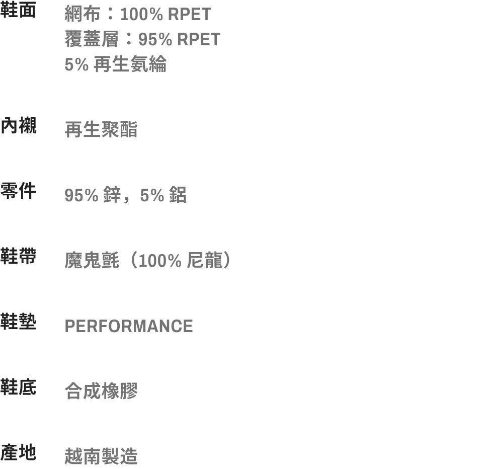 材質 鞋面:網布:100% RPET、覆蓋層:95% RPET、5% 再生氨綸