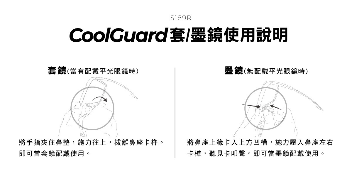 | 商品特色 | Sustainable:永續設計 ReNet:回收海廢漁網再生科技,以再生尼龍(Nylon6)製鏡,友善環境 ErgoGrip:可調式、可拆式防滑鼻墊,輕鬆轉換套/墨鏡使用模式 CVS:動力壓縮導流除霧設計 Screwless:無螺絲設計,易於回收分類再製 TAC PL:高清偏光鏡片、100%防紫外線、消除刺眼眩光,降低眼睛疲勞 |