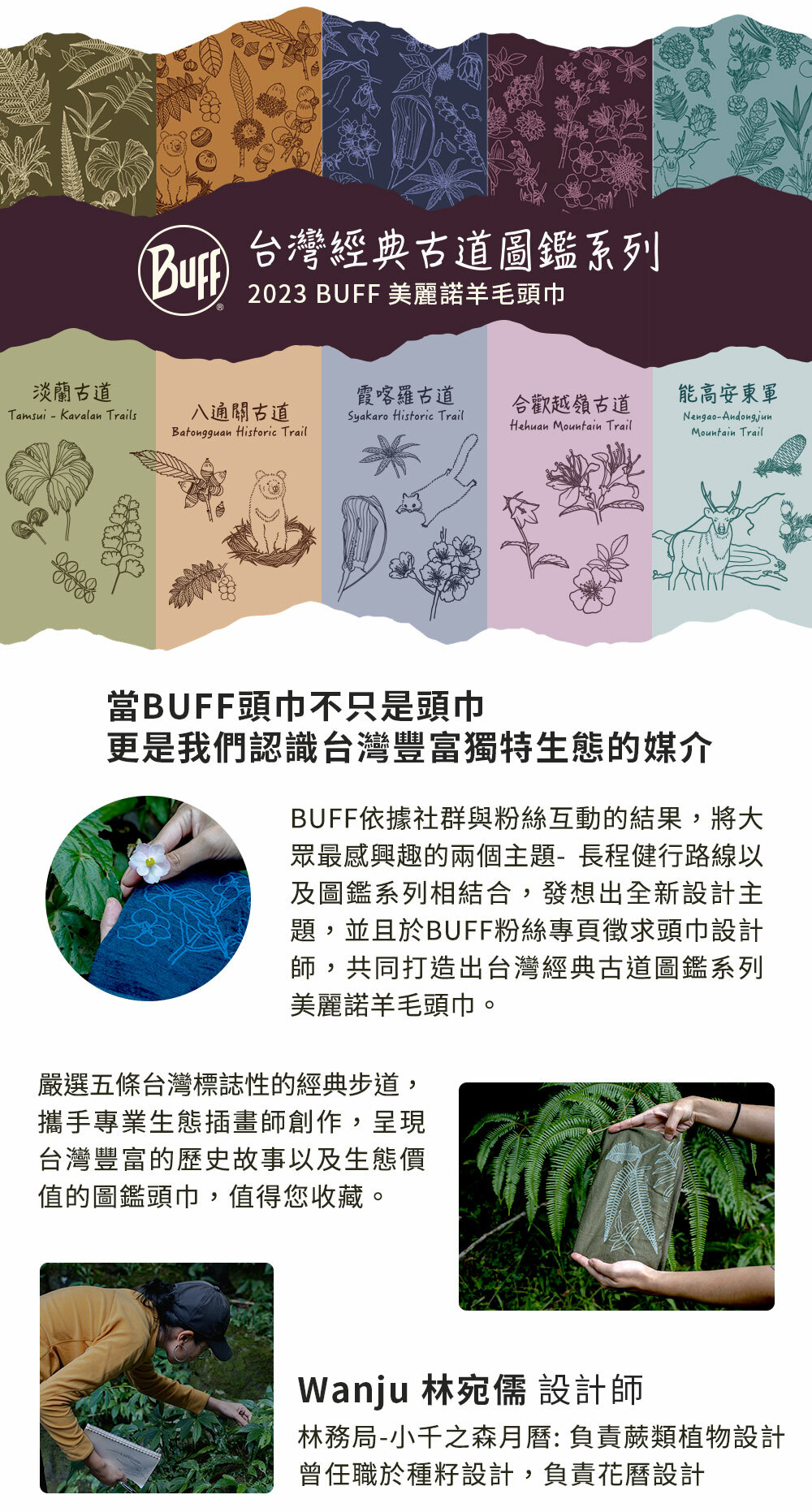 當頭巾不只是頭巾,更是我們認識台灣豐富且獨特生態的媒介,嚴選五條台灣標誌性的經典步道,攜手專業插畫家創作,呈現台灣豐富的歷史故事以及生態價值。