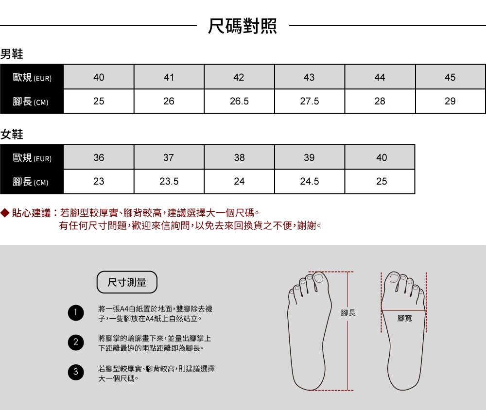 | 尺寸 | 若腳型較厚實、腳背較高,則建議選擇大一個尺碼 |
