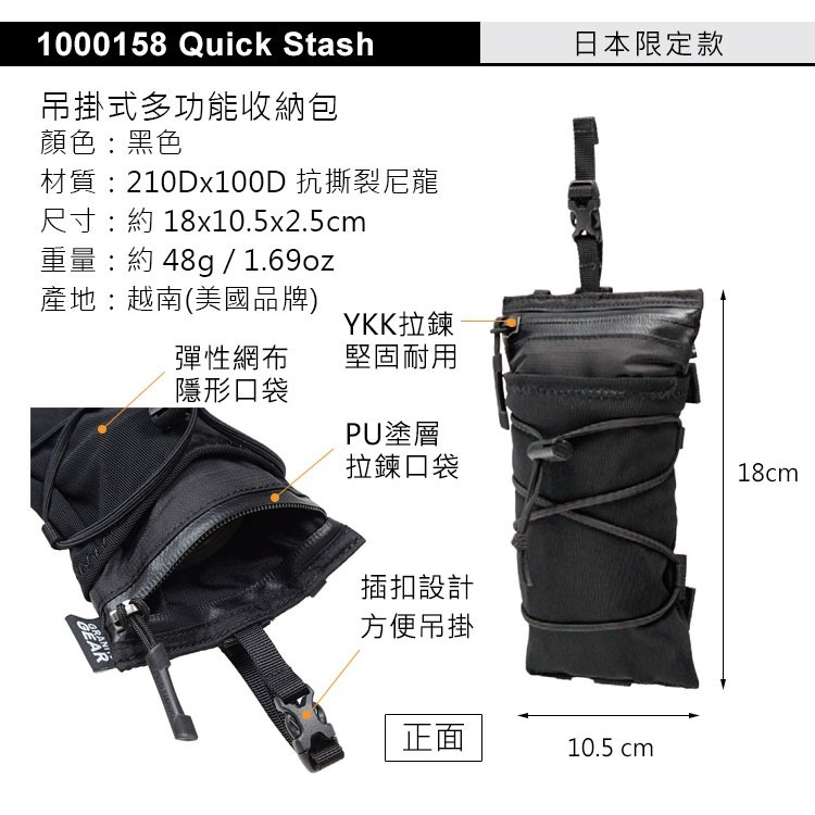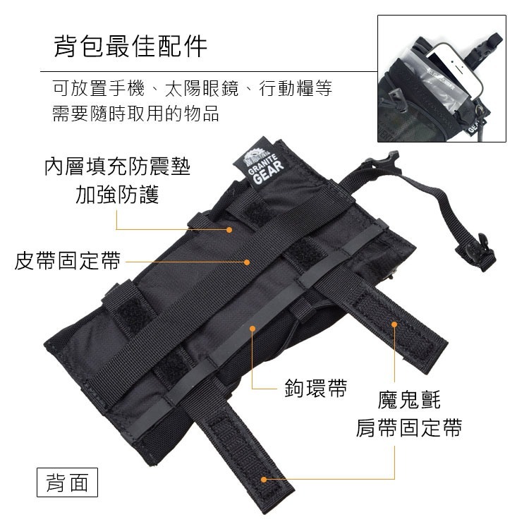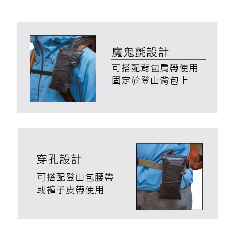 | 商品特色 | .穿孔設計,可搭配背包腰帶或褲子皮帶使用 .魔鬼氈設計,可搭配背包肩帶使用,固定於登山背包上 .內層填充防震墊,加強防護 .插扣設計方便吊掛 .YKK拉鍊堅固耐用 |