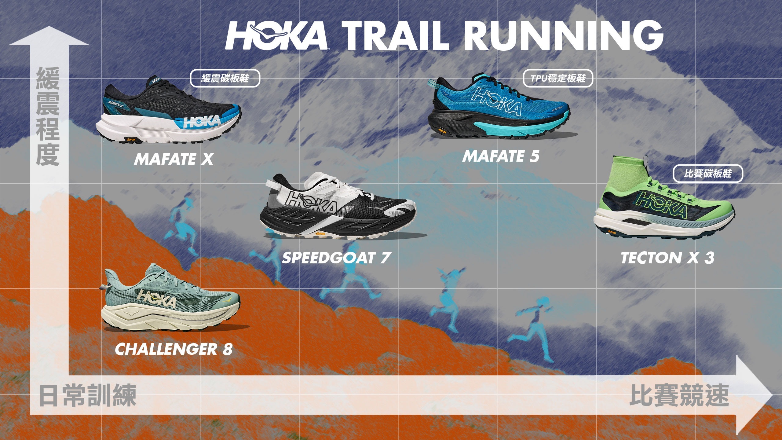 | 材質 | 中底:全新超臨界發泡 EVA 中底 (靈敏回彈與極致緩震) 大底:Vibram® Megagrip 大底、Traction Lug 技術 (5mm 刻痕) 鞋面:輕量 RPET 再生織物、彈性動態鞋面、平整貼合式鞋舌 |