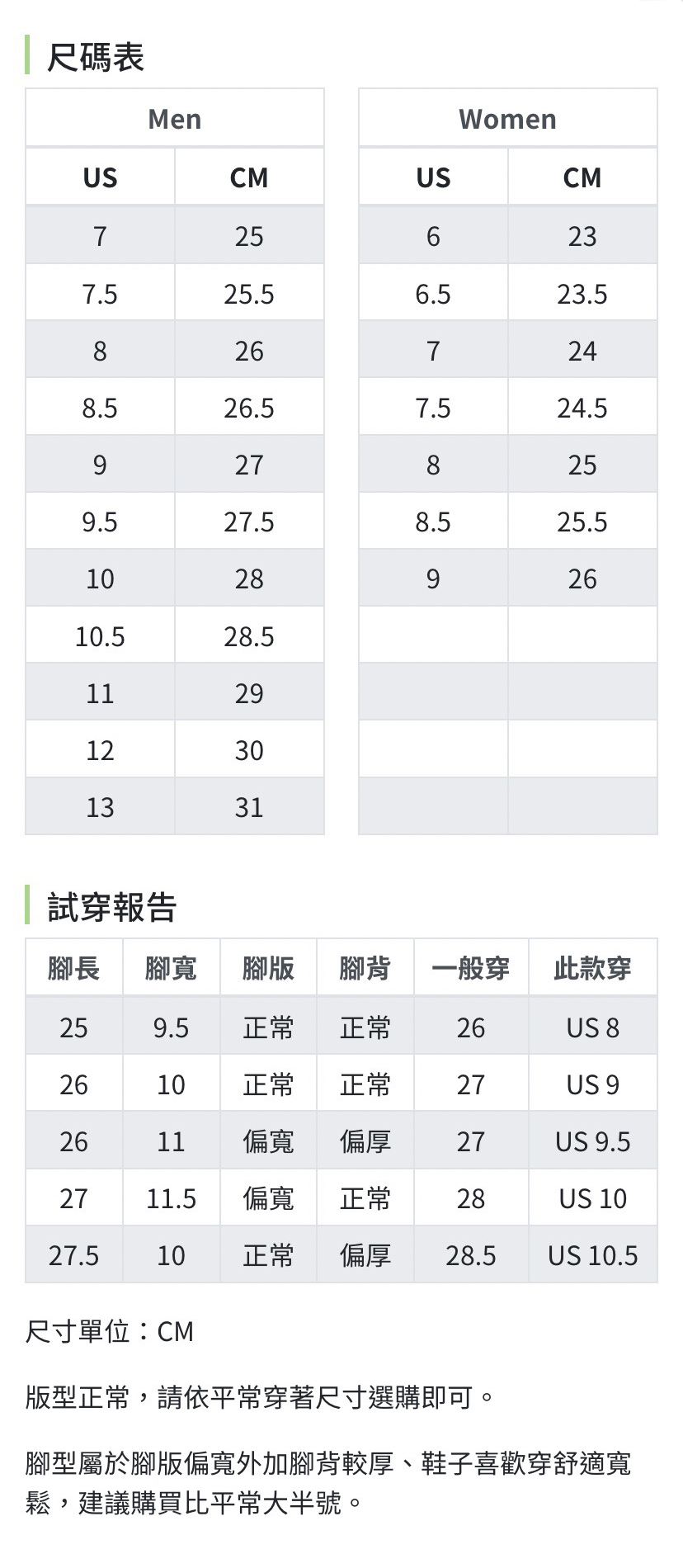 此款 版型正常 建議依平常穿著尺碼選購,例如: 一般穿27cm 此款穿27cm(US9)。