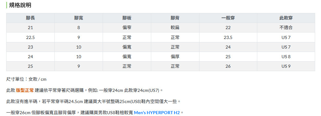 一般穿26cm 但腳板偏寬且腳背偏厚,建議購買男款US8鞋楦較寬 Men's HYPERPORT H2。