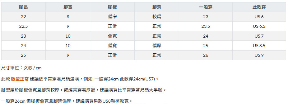 此款 版型正常 建議依平常穿著尺碼選購,例如: 一般穿24cm 此款穿24cm(US7)。