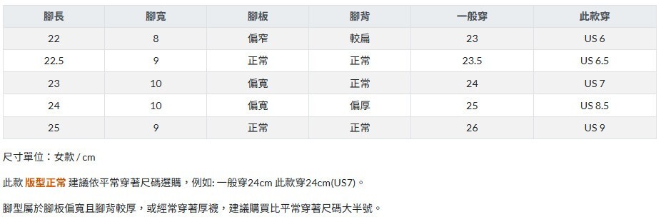 | 尺寸 | 此款 版型正常 建議依平常穿著尺碼選購,例如: 一般穿24cm 此款穿24cm(US7)。 腳型屬於腳板偏寬且腳背較厚,或經常穿著厚襪,建議購買比平常穿著尺碼大半號。 |