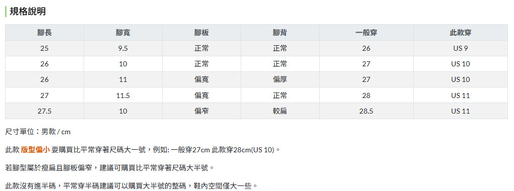 此款 版型偏小 要購買比平常穿著尺碼大一號,例如: 一般穿27cm 此款穿28cm(US 10)。