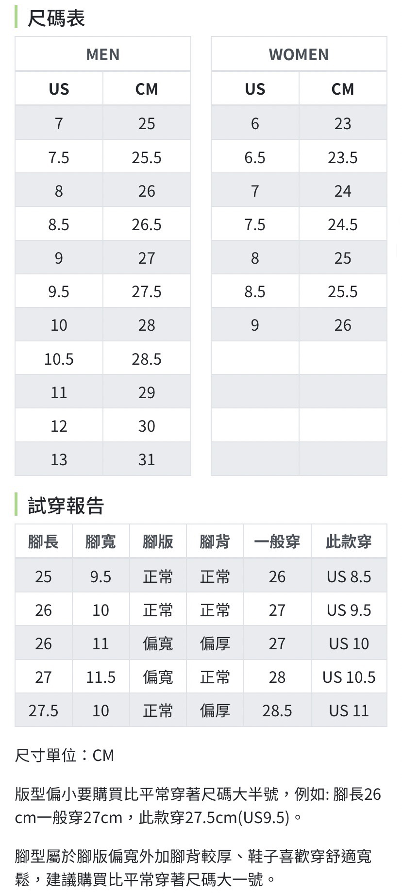 版型偏小要購買比平常大半號,例如: 腳長26cm一般穿27cm,此款穿27.5cm(US9.5)。