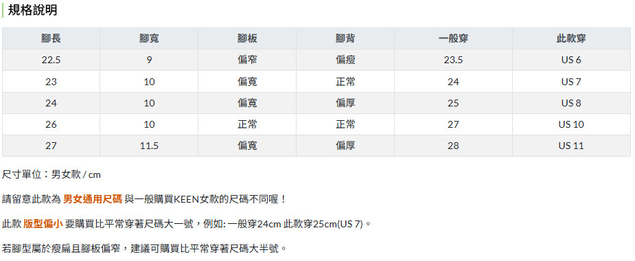 | 尺寸 | 請留意此款為 男女通用尺碼 與一般購買KEEN女款的尺碼不同喔! 此款 版型偏小 要購買比平常穿著尺碼大一號,例如: 一般穿24cm 此款穿25cm(US 7)。 若腳型屬於瘦扁且腳板偏窄,建議購買比平常穿著尺碼大半號。 |
