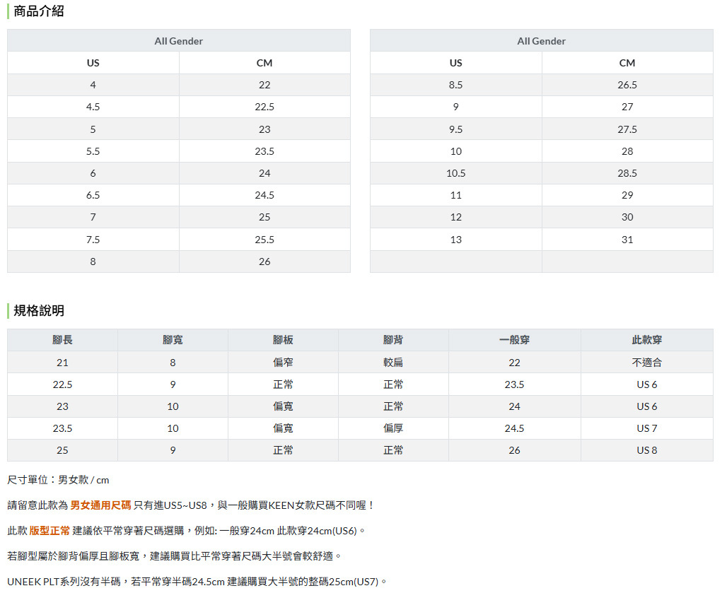 請留意此款為 男女通用尺碼,與一般購買KEEN女款尺碼不同喔! 此款 版型正常 建議依平常穿著尺碼選購,例如: 一般穿24cm 此款穿24cm(US6)。 若腳型屬於腳背偏厚且腳板寬,建議購買比平常穿著尺碼大半號會較舒適。 UNEEK PLT系列沒有半碼,若平常穿半碼24.5cm 建議購買大半號的整碼25cm(US7)。 |