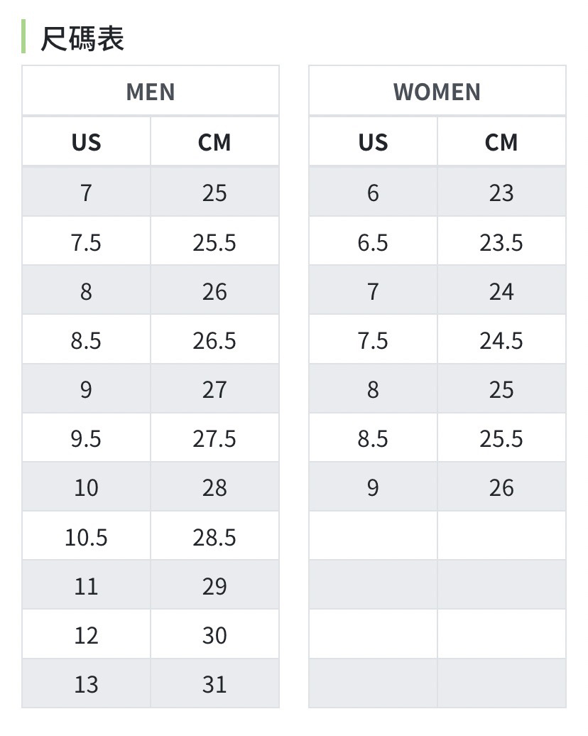 | 尺寸 | 此款 版型偏小 要購買比平常穿著尺碼大一號,例如: 一般穿24cm 此款穿25cm(US 8)。 若腳型屬於瘦扁且腳板偏窄,建議可購買比平常穿著尺碼大半號。 一般穿26cm 建議購買男款US 8,若腳板偏寬或腳背偏厚建議男款US 8.5 Men's UNEEK。 |