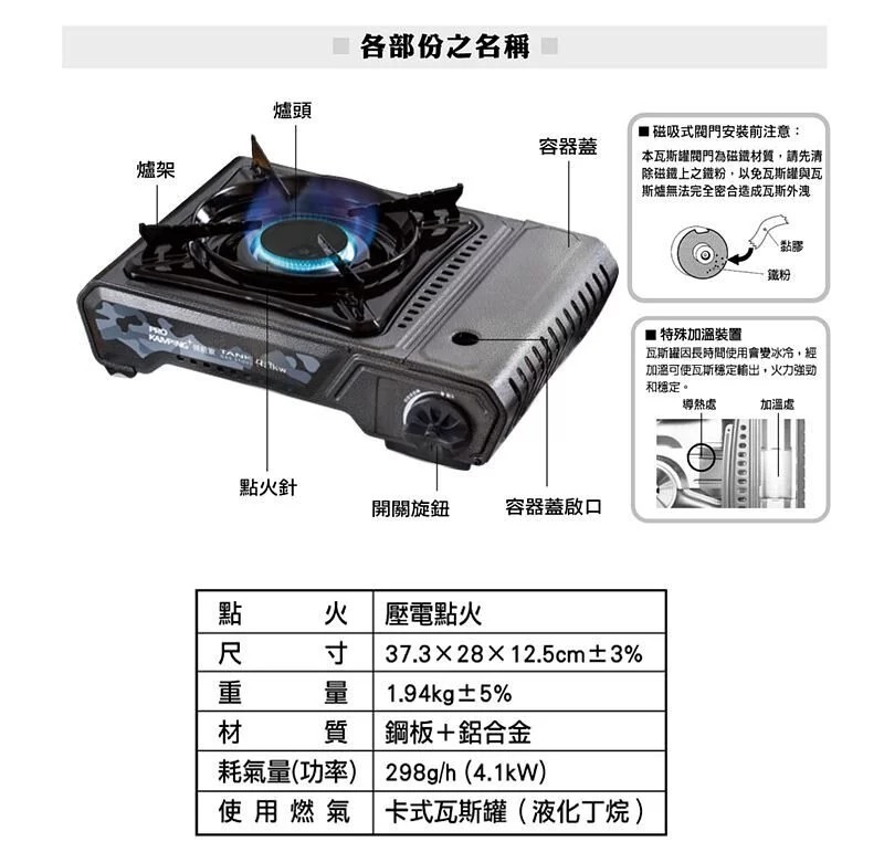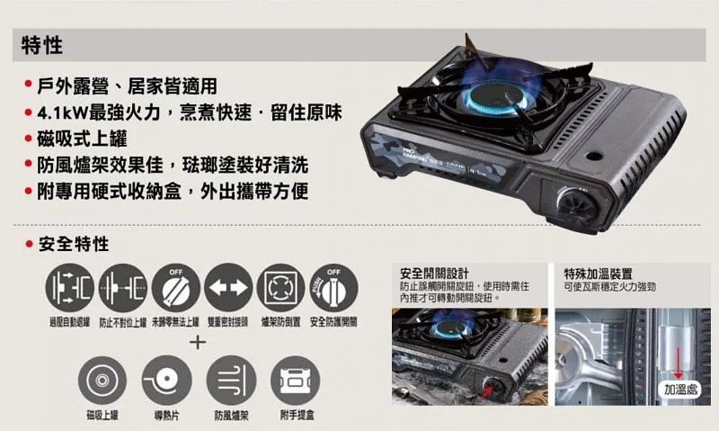| 商品特色 | 1. 戶外露營、居家皆適用 2. 火力最高達4.1KW,最強火力烹煮快速留住原味 3. 磁吸式上罐、瓦斯罐導熱片及安全退罐裝置,使用上相當安心 4. 防風爐架效果佳、琺瑯塗裝好清洗 5. 附專用硬式收納盒,外出攜帶方便 |
