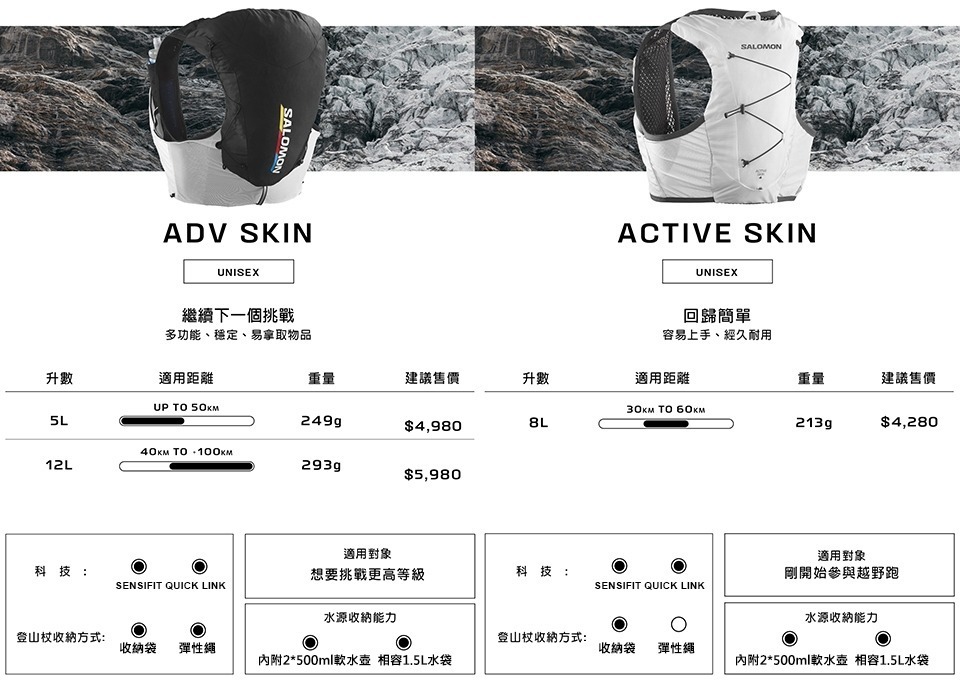 | 商品特色 | .支撐、穩定性與貼合包覆感兼具的全能補水英雄 最暢銷的水袋背心全新回歸,升級後提供更卓越的穩定性、貼合性與多功能性。 專為挑戰極限耐力賽與跑者打造,Adv Skin 5 背心確保補水便捷、長距離舒適性及活動度更加自由靈活, 5公升版本特別適合 60 公里以上的長距離越野挑戰。 .輕鬆補水 專為快速且便利補水所設計,配備全新軟水壺,能輕鬆放入前置口袋, 無論跑步強度多高都能穩定不移位。 .活動自由不拘束 採用 SensiFit™ 設計,緊貼身體且舒適包覆, 搭配全新的「Y 型」結構,有效分散重量。 .極致多功能性 配備多處調整設計、大容量收納空間與多個口袋,包括後方的大型隧道口袋及內部的拉鍊口袋。 此外,側邊還配有壓縮繩,滿足各種需求。 |
