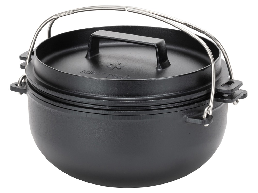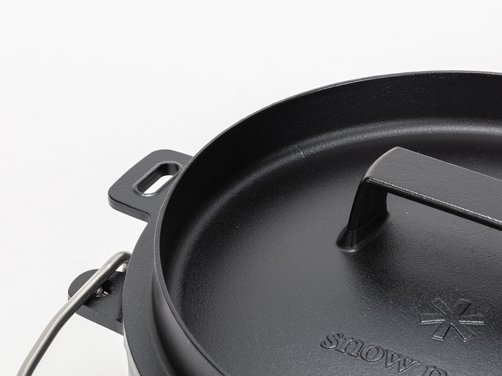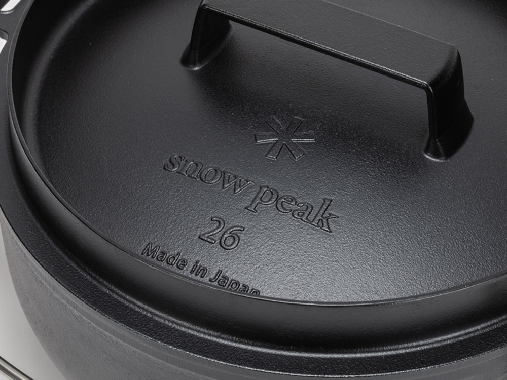 Snow Peak採用強韌而富有彈性的材質,打造出質地極薄、輕巧程度令人訝異的鑄鐵荷蘭鍋。湯鍋的底部形狀為功能性設計,能有效導熱、迅速加熱食物。造型與質感都與日本傳統鐵鍋類似。湯鍋直徑為26cm,煎盤也是套組內的標準商品。煎盤和湯鍋都可用電磁爐加熱。衍生自燕三条極薄鑄鐵的概念,讓荷蘭鍋進入革命性的新領域。
