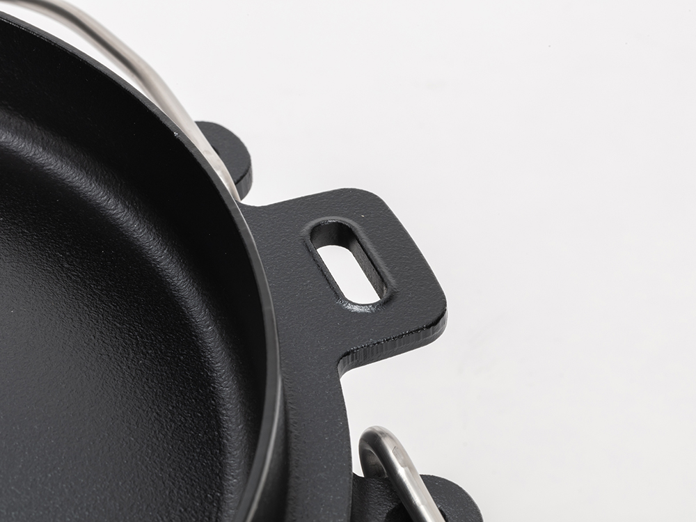 鑄鐵鍋本體上緣、大型平煎盤以及鍋蓋的左右兩側都有把手,把手形狀為功能性設計,可搭配鑄鐵鍋專用提把使用。