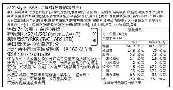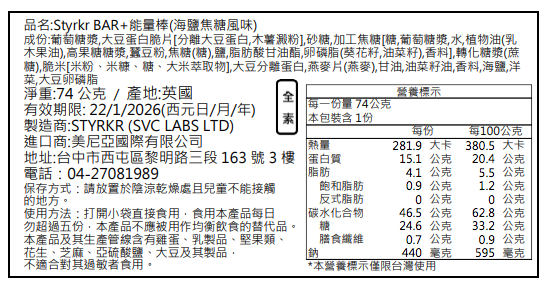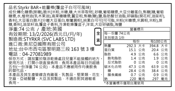 ![]() 每一條Styrkr BAR+ 的成分是什麼?
