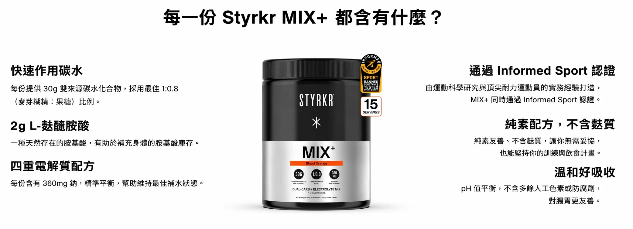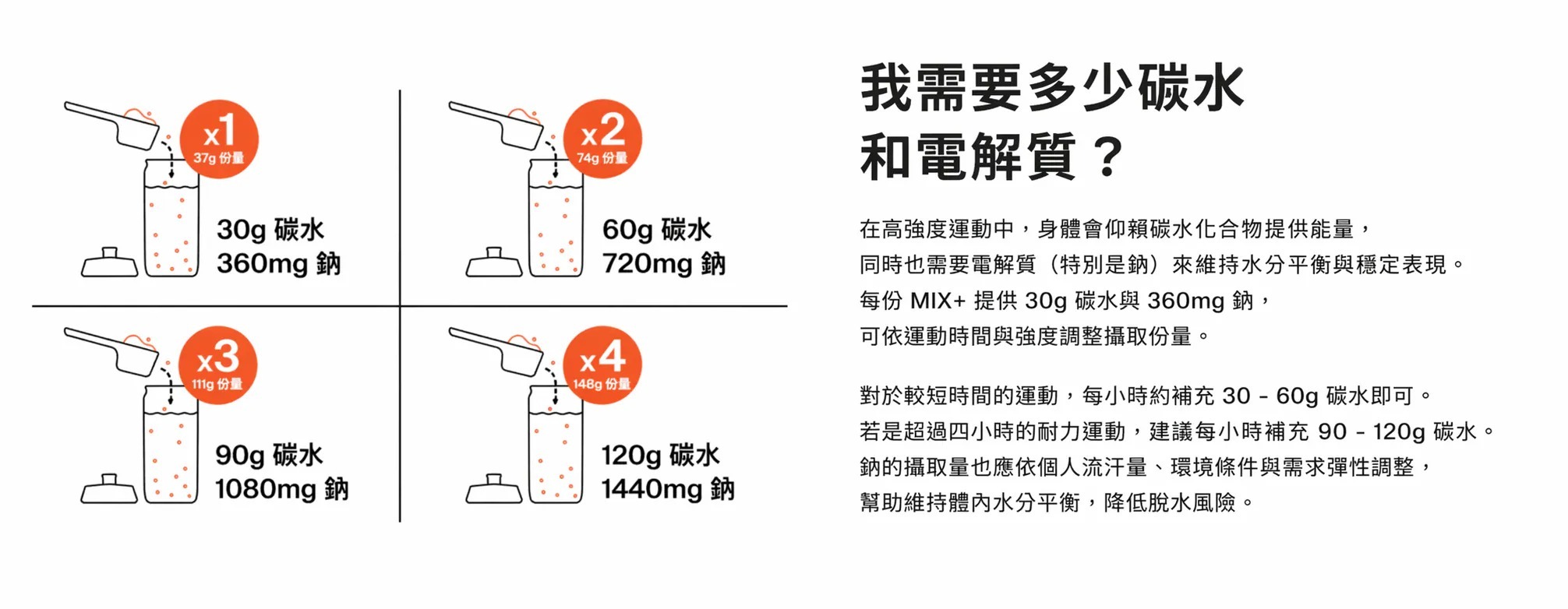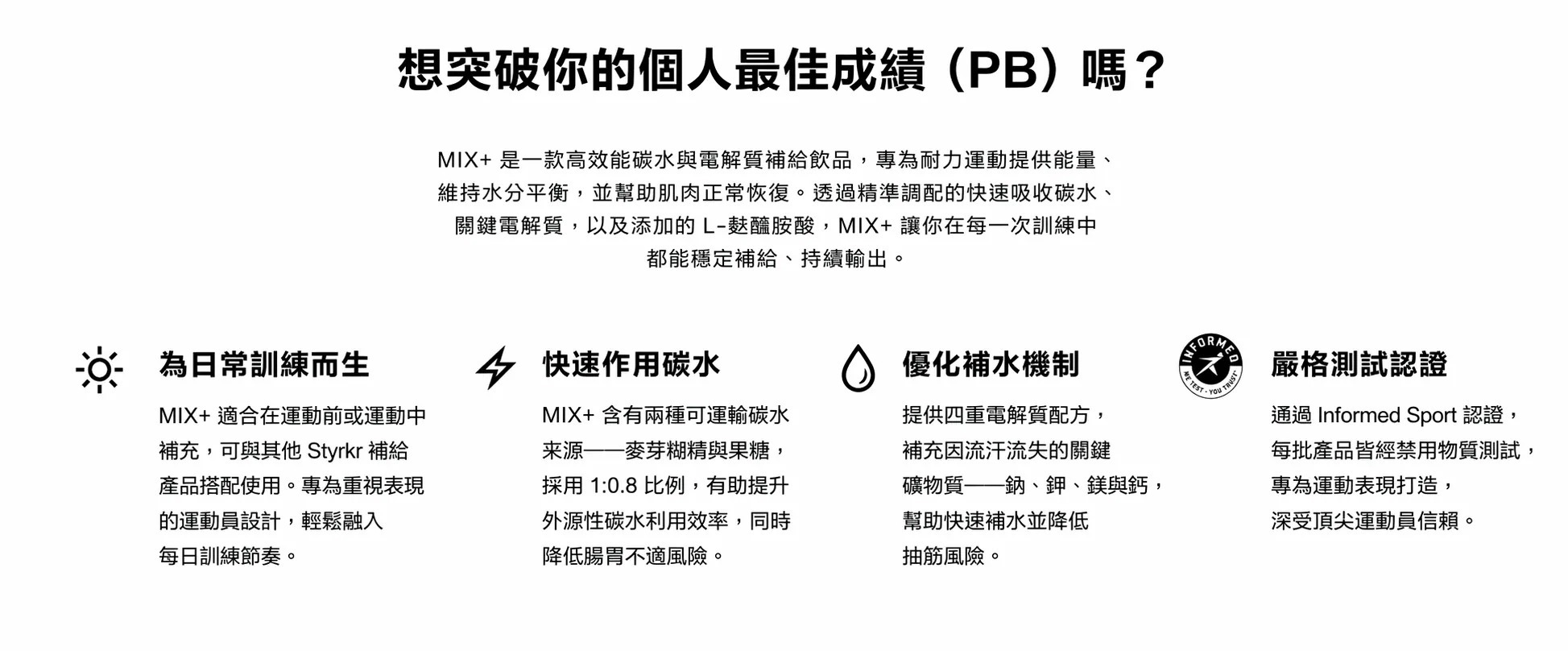 | 商品特色 | MIX+ 採用雙來源碳水化合物與關鍵電解質配方,搭配清爽柑橘風味,能快速補充能量、支援運動表現並促進恢復。 作為日常訓練的理想補給,特別適合晨練族群——無論是空腹訓練,或來不及進食早餐時,都能有效提供所需能量。 .每份提供 30g 雙來源碳水化合物 採用最佳 1:0.8 比例,溫和好吸收、不易造成腸胃不適 .添加 L-麩醯胺酸(L-Glutamine) .電解質比例貼近人體汗水組成,並額外補充鈉 有助於快速補水並降低抽筋風險 .由專業運動營養師研發,並經運動員實測驗證 .通過 Informed Sport 認證 .100% 純素配方,英國製造 |