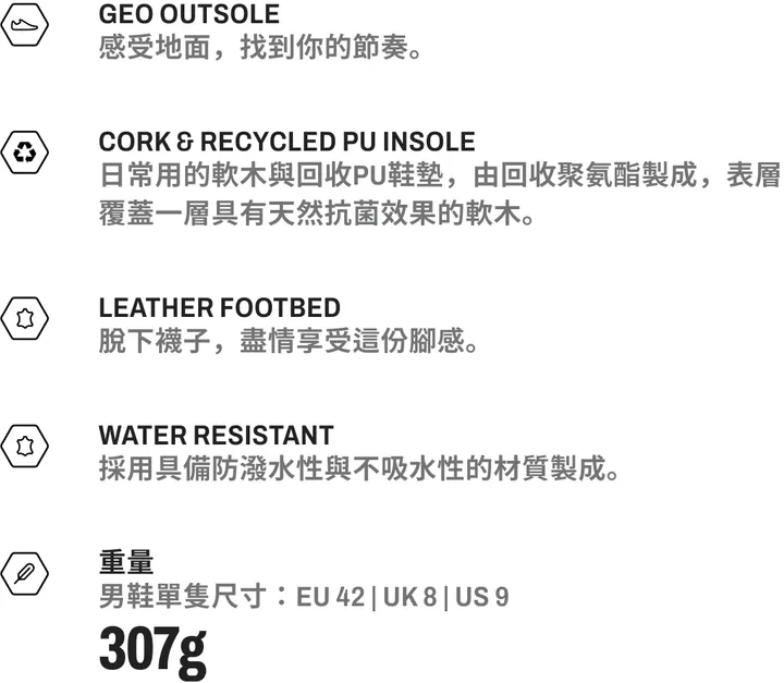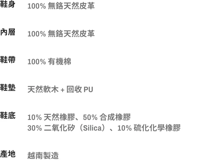 | 材質 | 鞋身:100% 無鉻天然皮革 內層:100% 無鉻天然皮革 鞋帶:100% 有機棉 鞋墊:天然軟木+回收PU 鞋底:10% 天然橡膠、50% 合成橡膠、30% 二氧化矽 (Silica)、10% 硫化化學橡膠 |
