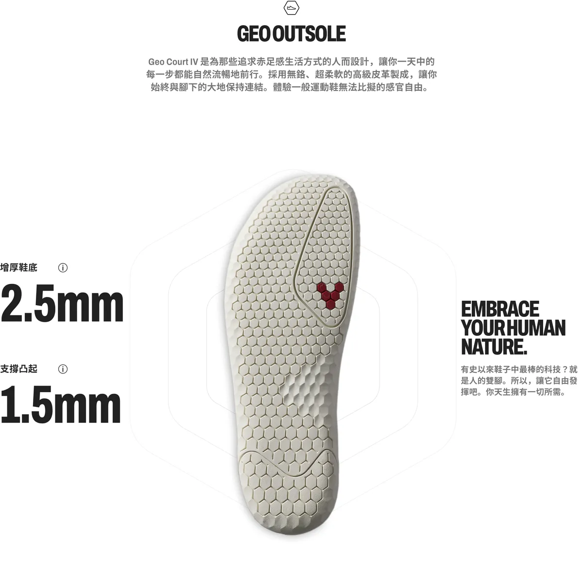 | 商品特色 | Geo Court IV 是為那些追求赤足感生活方式的人而設計,讓你一天中的每一步都能自然流暢地前行。採用無鉻、超柔軟高級皮革製成,讓你始終與腳下的大地保持連結。體驗一般運動鞋無法比擬的感官自由。 |