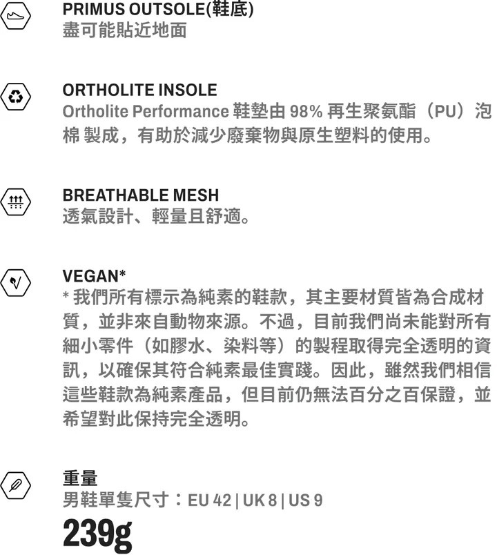 | 商品特色 | 我們最暢銷的赤足訓練全能鞋款,如今重新優化設計,以更聰明的材質運用與更少的生產浪費打造而成。 Primus Lite IV 延續一貫值得信賴的赤足腳感,採用再生與純素*材質製作——無論是跑步或訓練,都能自然自在地移動。寬楦、薄底、靈活設計,全面提升每一次運動表現,同時留下更輕盈的環境足跡。 Primus Lite IV 是一雙多功能高性能訓練鞋,適合跑步、健身訓練及您的日常生活,幫助您以自然的方式移動。 寬楦設計帶來自然穩定性,薄底提供真實地面回饋,靈活的設計,支持自然動作。經重新優化的鞋子結構,提升製造效率,同時在降低生產浪費的前提下,依然保有純粹的赤足體驗。 |