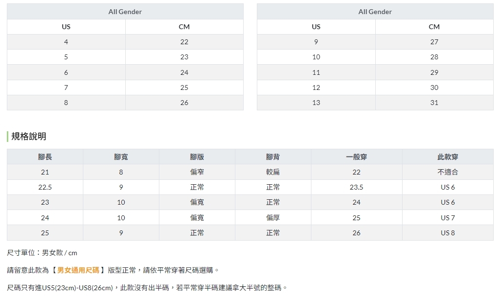 尺碼只有進US5(23cm)-US8(26cm),此款沒有出半碼,若平常穿半碼建議拿大半號的整碼。