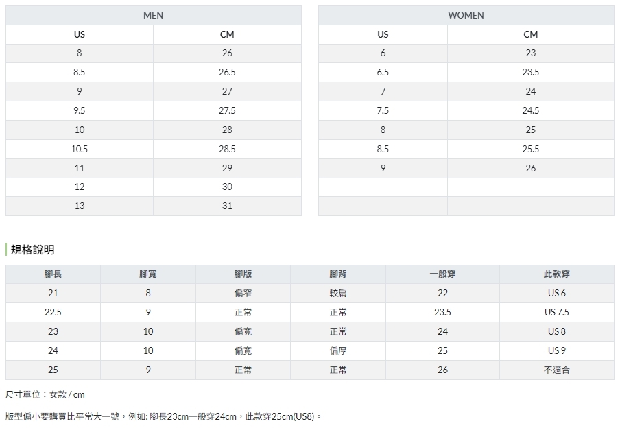 版型偏小要購買比平常大一號,例如: 腳長23cm一般穿24cm,此款穿25cm(US8)。