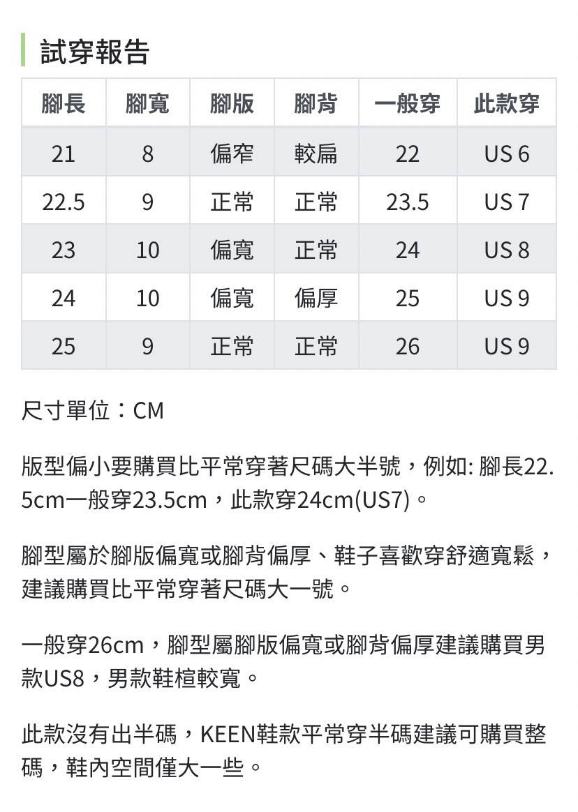 一般穿26cm,腳型屬腳版偏寬或腳背偏厚建議購買男款US8,男款鞋楦較寬。