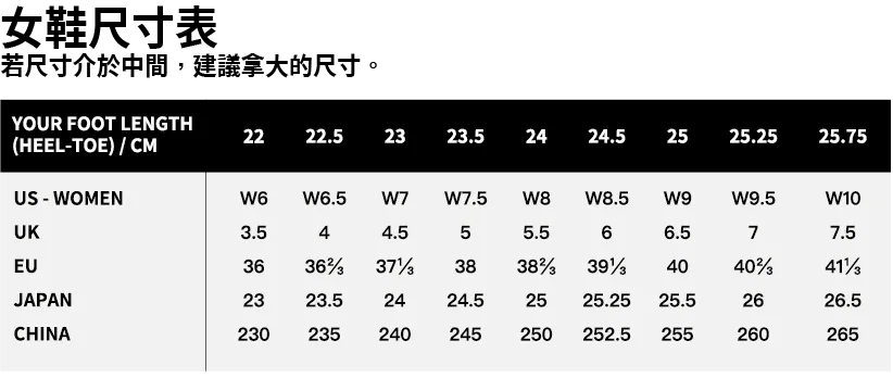 | 尺寸建議 | 由於無鞋帶滑套設計追求極致貼合,建議選購時比平常尺碼大一號,以取得最佳舒適度。 |