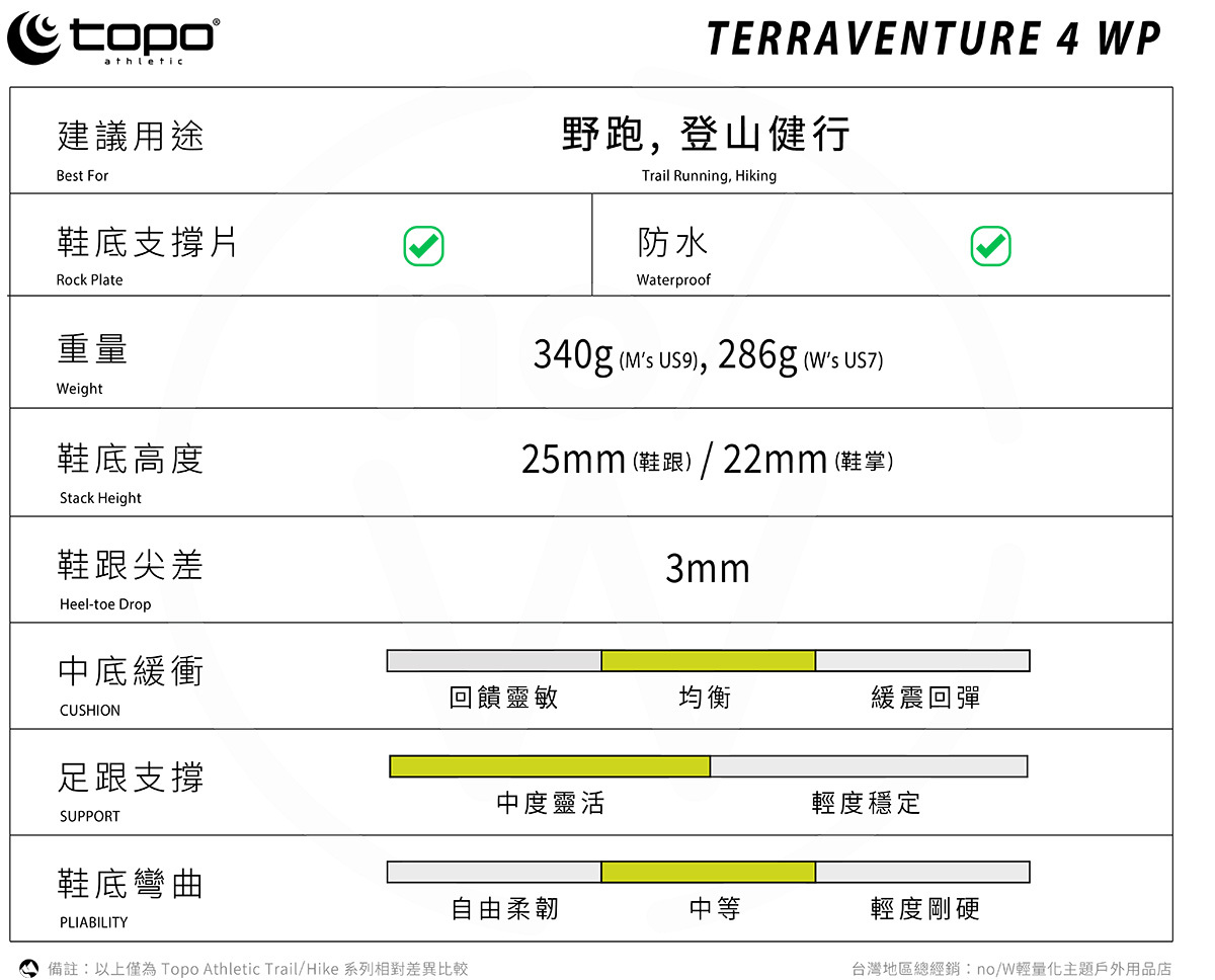 | 商品特色 | .Topo Athletic 標誌性的寬敞鞋頭,使前腳掌與腳趾擁有能完全舒展的空間,符合天生行走與跑步的人體工學,其設計能有效地促進足部健康。 .2023年全新改款的第四代 Terraventure 4,專為追求敏捷靈活的移動、崎嶇地形的穩定而設計,適合短程野跑與長程健行。 .採用擁有直接透氣技術的 eVent® 防水內襯結構,讓雙腳在潮濕條件下保持乾爽舒適。 .前腳掌上鞋面升級使用更透氣的新型材質,並增加厚度以提昇耐用;鞋子中部至尾部則使用大網眼材質以助於排水,並能加速內部乾燥速度。 .Vibram® Megagrip 配方的外鞋底,加上 6mm 鞋齒深度,能提供不論乾濕的多地形的終極抓地力。 .使用全新一代的 ZipFoam™ v2 中底配方:更輕盈的重量下,帶來更柔軟、彈性更強的中底,並獲得更靈敏的動力回饋。 .追求輕盈的 25x22mm 鞋底厚度,提供更多的地面腳感,但前腳掌鞋底具有 Rock Plate 支撐片,提供足夠的保護性。 .3mm 低落差的足根尖差能改善自然跑姿與小腿肌肉的使用,提供最佳的自然姿勢。 .採用高性能的 OrthoLite® 抗菌鞋墊,提供舒適感與抑臭功能。 |